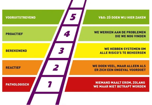 de Veiligheidsladder kent 5 tredes. Hoe hoger, hoe volwassener het systeem.